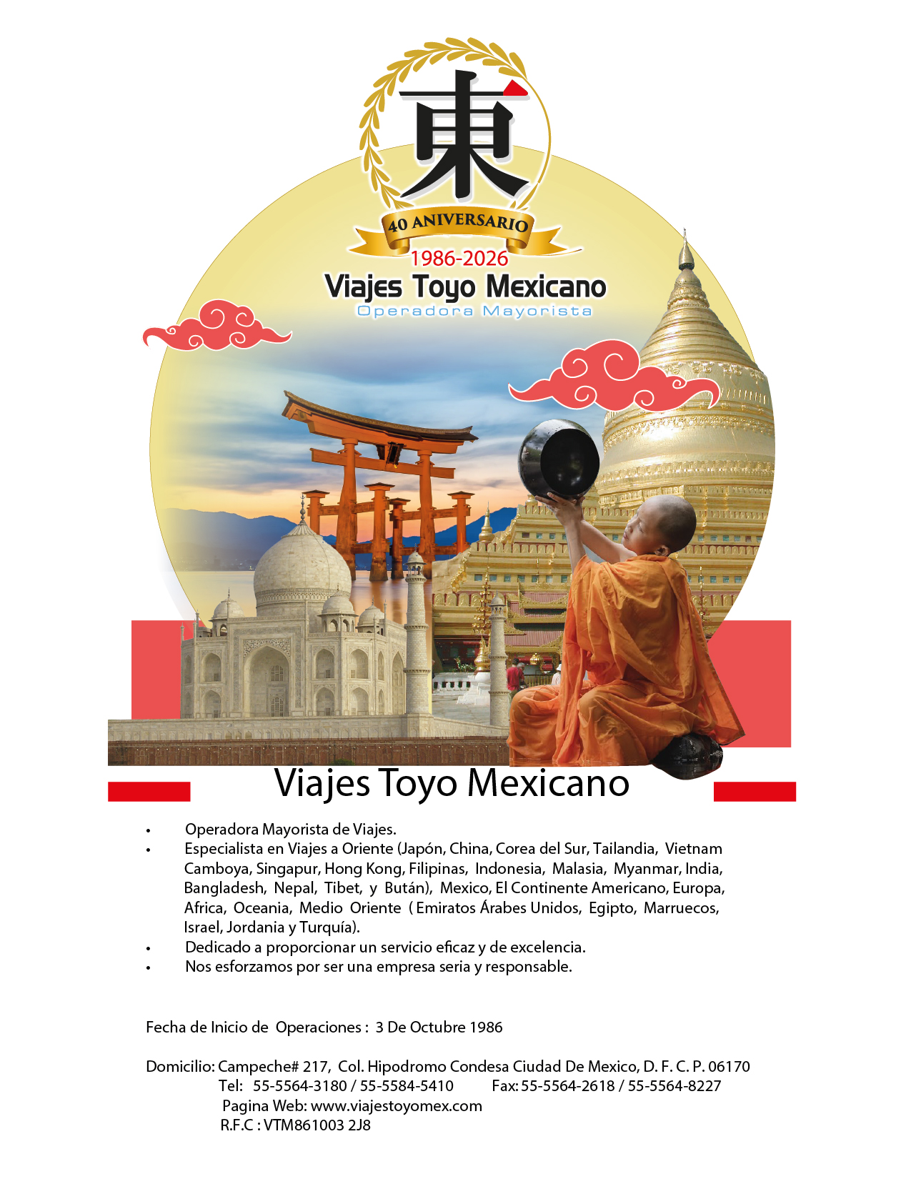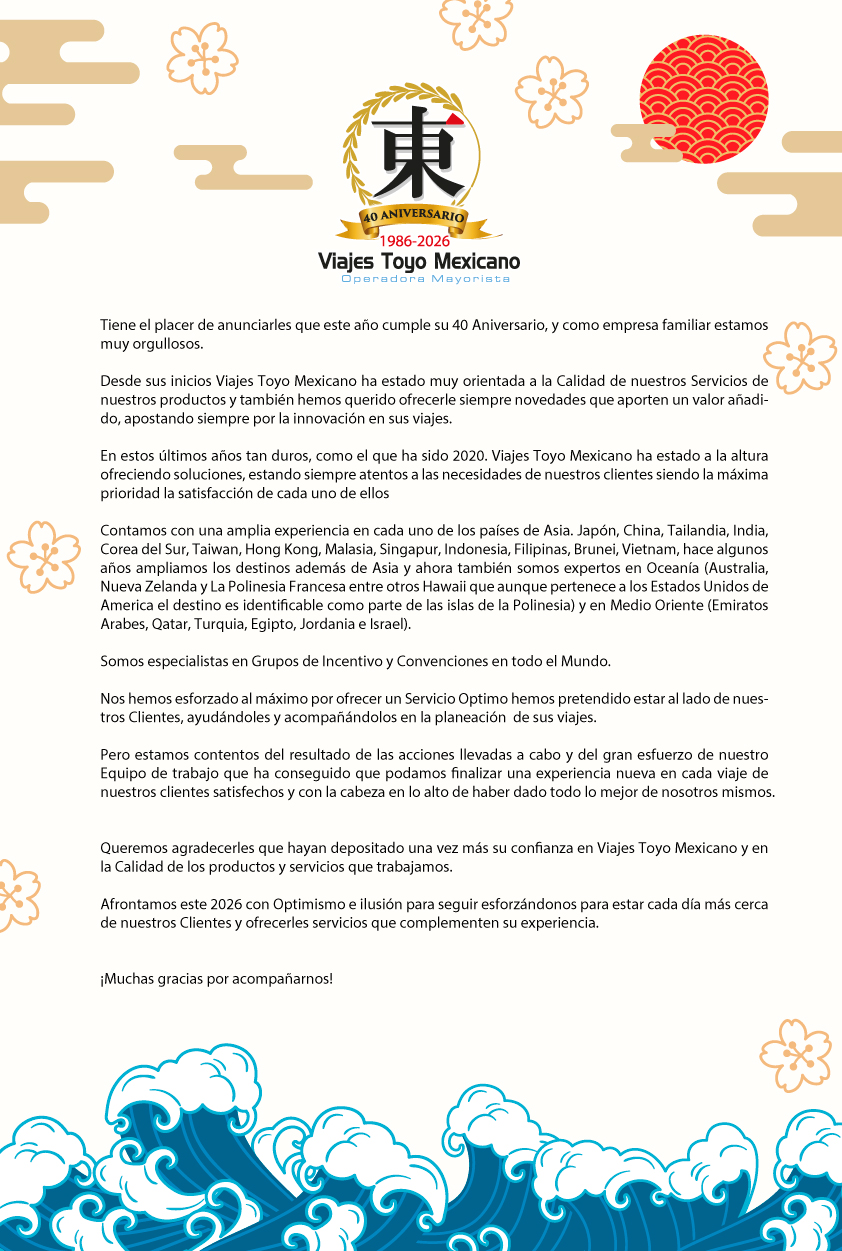 ContactanosViajes Toyo Mexicano, S.A de C.V.Campeche #217, Col. Hipodromo Condesa Alcaldia Cuauhtemoc, C.P. 06100 CDMX, México, Tels.: 55-5584-5410 Horario: Lunes a Viernes de 9:00 am a 18:00 pm Informes outbound@viajestoyomex.com 日本語での対応をご希望の方はこちらへご連絡ください↓ |